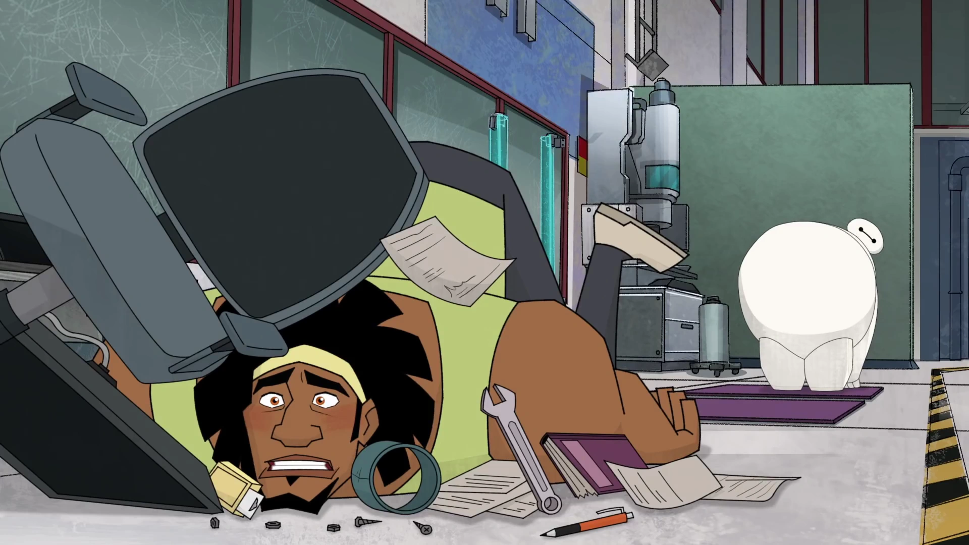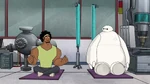 At the SFIT lab, Wasabi introduces Baymax to yoga. Fred plays his sitar, but leaves after Wasabi expresses annoyance and being unable to focus. After Wasabi explains the concept of yoga, Baymax adds it to his care-giving matrix. Baymax also includes a function to alert him when Wasabi experiences stress, and so Wasabi starts to teach Baymax a "boat pose". However, when Baymax attempts to do the pose, he rolls over and crashes, stressing Wasabi as the alert makes a noise.
