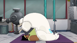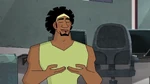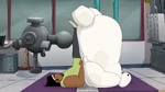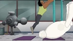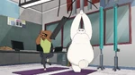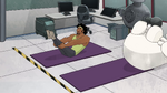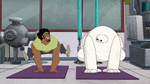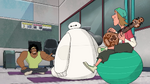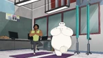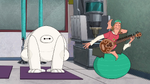 They continue to try other poses, but Baymax continuously has accidents that hurt Wasabi, triggering more stress alerts. Noticing this, Baymax tells Wasabi to try to relax, but Wasabi sarcastically yells he is relaxed and says that they are done, then walks away whilst being visibly upset. Fred then reappears and plays his sitar once again.