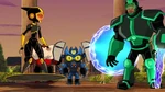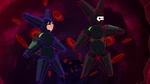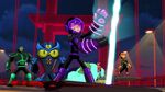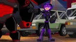 Meanwhile, Big Hero 6 is eventually overwhelmed by their opponents. Go Go has the team lure the monsters into one place to concentrate their efforts. During his fight, Fred comes up with a back-up plan and has Mini-Max leave to execute it. Back at Sycorax, Hiro's microbot force-feeds the lead parasynth enough cure that disintegrates it, finally purging Liv of the parasynths. Hiro requests Di cure Karmi, but Di instead tries to mutate Hiro now that he is aware of her true intentions and has Karmi attack Hiro with the press of her phone.