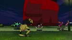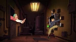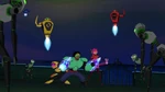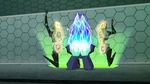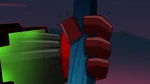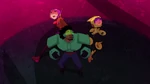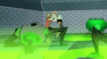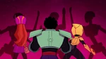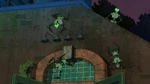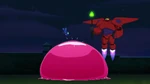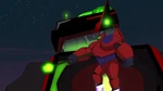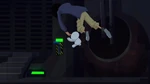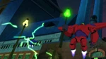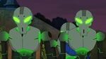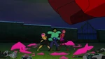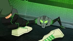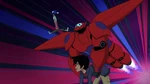 Hiro, Fred and Mini-Max run to the Sim-Max room but Baymax stays behind because he is slow. In the training room, the Queen orders the training robots to attack them whilst calling them her knights. Hiro attempts to call Skymax to bring them their suits, but the Skymax bots have also been corrupted as Fred's Skymax destroys his kaiju suit. It is then that Wasabi, Honey and Go Go break into the base through the training room, destroying the training bots and saving the others. They quickly sneak into the factory floor to shut down the base, where Wasabi, Honey and Go Go explain that they knew Hiro and Fred were in trouble because Fred suddenly stopped sending them annoying mesages.