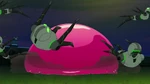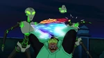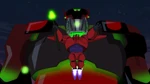 Mini-Max tries to shut down the base by pulling a lever, but is stopped by Baymax, now calling himself "Baymaximus, the Sorcerer of Spamibia" and at the same time infecting Mini-Max to become the "Sorcerer's Apprentice". The human heroes are thrown outside by the base's bots, when suddenly Mega-Max rises as "The Ogre King" to attack as well. Hiro believes he can shut Basemax down from the generator room, so Go Go gives him a ride in her mag-lev disc to enter through a vent. The others continue to fight outside while Hiro is stopped by the Queen, who constantly changes the real shutdown button to make it harder for Hiro to stop her. Fred ends up falling in the same vent while the rest try to shield themselves with Honey's chem-ball dome, until Fred rolls into the generator room and accidentally presses the correct button with his face, shutting down every bot before Mega-Max crushed the rest of the team.