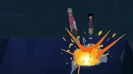 The room overheats and explodes, sending Hiro and Fred out, but they're saved by Baymax and Mini-Max, respectively. Mini-Max mentions that he has no memory of what happened while he was infected, and the team thank Hiro for saving them. Yet, Hiro tells them it was actually Fred who saved them. Go Go protests by saying that the situation was also his fault, though Fred claims he "learned a lesson" from it. Hiro claims the lesson is to never let him check his e-mail by himself, but Fred says it actually was that he won't eat more than 3 Noodle Burgers, though also saying he can learn more than one thing at a time. Despite this, he notices that he received yet another spam message and opens it before his friends can stop him, starting yet another alarm that upsets the rest of the team.