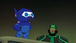 Meanwhile, Wasabi bursts into the Conference Room with Mini-Max, telling the team that he was able to teach the class, but they're still gone. Basemax informs him that they've been gone for 30 minutes, concerning him. He suits up and goes with Mini-Max to rescue them. He drives to the warehouse, and forms a plan with Mini-Max, while Roddy is stalling. Wasabi pretends to surrender, and give Sue and Stu their HQ, and brings them to an abandoned deli. Turns out, the police are there to arrest them! Buddy Guards tie the duo up, but Wasabi is too. Sue demands Wasabi to say something, but he's too nervous. Mini-Max distracts the cops long enough, so he turns Wasabi invisible with a flexible display cloth, allowing them to escape.