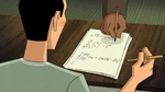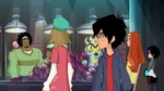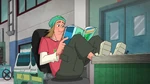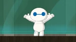In Fred's room, Baymax recommends envisioning a peaceful beach, but Wasabi starts imagining a conga line of people wanting him to be the lead, freaking him out again. So Fred leads a blindfolded Wasabi to a high tower in the city but ends up terrorizing him. At HQ, Hiro and Honey Lemon use Simmax to help Wasabi get over his stage fright, but when the students are simulated, they glitch out until only their eyeballs are shown, which come towards Wasabi when Hiro tries to fix it, so he is scared again. In the Conference Room, he's folding origami swans when the team apologizes; he says he needs to figure out his problem on his own but appreciates their support. They get a pre-recorded video call from Roddy, telling them that he's been abducted. The team leaves to rescue him, but Wasabi has to stay behind for another class.