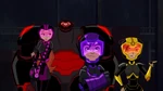 Meanwhile, at SFIT, the team is doing their own thing, when Baymax announces its's time for a standing break. Then, Professor Granville calls for Wasabi in a video call. She tells him that the teaching assistant for first-year quantum optics is absent for a family emergency, and needs Wasabi to fill in. She's even in the room to give him many books, including student bios. Wasabi feels terribly nervous at this, due to his fear of public speaking, as he curls up on the floor. He tries some yoga after Baymax suggests it, but it backfires when he imagines being in front of a large crowd. Fred is streaming him at this moment, to his chagrin, but then learns that Supersonic Sue busted out of prison.