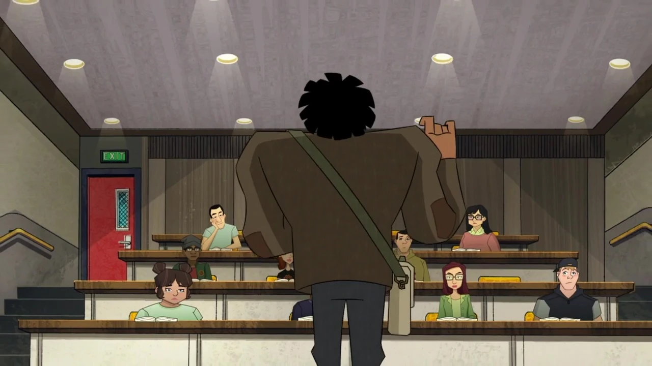 The next day, Wasabi goes in again, telling himself that he loves public speaking, he's good at it, and people are inspired by his words. But he starts daydreaming about becoming the greatest professor at SFIT; including giving As out, helping with a baking soda volcano, clearing up a disorganized guy's desk, sitting with students at lunch, helping a guy during a test, shielding a girl from the rain with an umbrella when she dropped her papers, revealing he's staying at SFIT, getting a diploma with his pupils, earning a reward for his teaching (Best Professor at SFIT), and even looking through the student yearbook and admiring a statue of himself on campus in his senior years. Turns out, he stayed 6 hours after class again. He walks into the main lab, feeling down about freezing up again, especially since Fred streamed him again, so Baymax later helps him out.