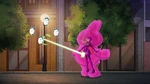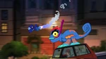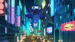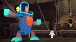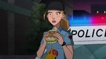 Later in the afternoon, Mini-Max helps Fred by spraying the Fredmeleon suit's tongue so that it won't dry out. Fred quickly suggests Mini-Max to "test it out" on a secret night patrol and Mini-Max agrees even though he claims it's complete nonsense. Meanwhile at Lucky Cat Café, Cass gets ready to go out for dinner with "a friend", denying to Hiro that it was a fancy date. When someone knocks at the door, Hiro answers and sees Chief Cruz and Megan. Baymax points out that Cass and Cruz's heart rates elevated, so both hurry to leave while Megan and Hiro stay at the café. Out on the streets, Fred is teaching Mini-Max about self-narration while they swing and fly around the city, until Fred crashes against a billboard and falls down, sticking its tongue on a bus and being dragged around until the tongue unsticks and causing them to get thrown to another part of the city, landing right outside a Noodle Burger restaurant. Unfortunately for both, a police officer eating a burger saw them, causing them to run away as the officer called the rest of the police force to chase them.