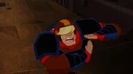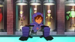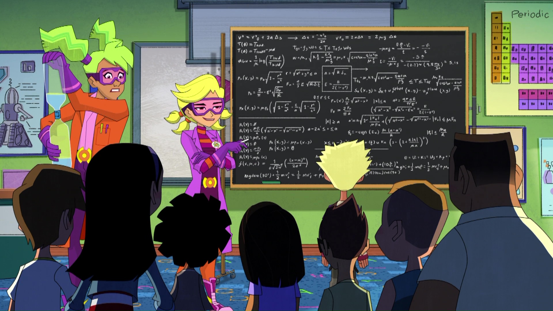 At Big Hero 6's base, Hiro asks Basemax to show him their villain database to see if any of their former enemies could be behind it, but the majority of the villains are incarcerated or retired. Back at Wendy Wower's Science Hour, Go Go sings a song about Dark Matter, which again is off-putting for the kids except for the Weird Little Boy, who actually enjoys it. Hiro continues his search with no suspects still, until Baymax tells him he has received the security camera footage from the Sciencetorium—where they see Supersonic Stu sneaking around. Although Hiro doubts it could actually be him, they decide to follow the lead and track him down. Upon finding him, they tell him that he can't escape without the help of his nana but Stu shows them that he has new rocket skates which enhance his powers and allow him to escape.