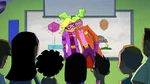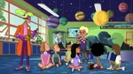 Meanwhile, Wendy tells Go Go to act more cheery in order to blend in better, so she makes an attempt while explaining static electricity to the kids. As Hiro and Baymax continue to chase Supersonic Stu through the city, Go Go actually starts to have fun with her undercover role and enjoys singing songs for the kids until the show ends. Hiro and Baymax catch up with Stu, but he asks for a time-out because he's exhausted and doesn't actually know why they're after him. Hiro and Baymax tell him about the note that Wendy received, but Stu tells them that he would never do that because he is a Woweroo himself and enjoys Wendy Wower's show, and the only reason he was at the Sciencetorium is because his grandma thinks he is actually a science genius even though he is actually not. Hiro and Baymax leave Stu as they figure that, since it wasn't him, then the real person responsible must be at the Sciencetorium still.