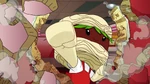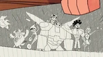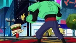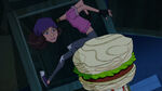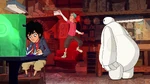 Meanwhile, Fred and Honey Lemon follow a track of pickle-juice and find the still malfunctioning Noodle Burger Boy in an alley. He soon attacks them and everyone around them. Both are busy with protecting the citizens and the Burger escapes. When Wasabi and Go Go arrive they fight Noodle Burger Boy, too which ends up with Noodle Burger Boy losing a leg. Noodle Burger Boy sees the Logo on his food and continues his way 'home'. The team realizes that 'home' is Krei Tech, where he was originally built, and that Hiro is in danger.