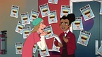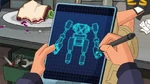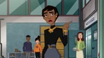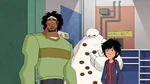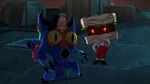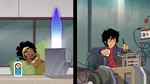 Meanwhile, at the San Fransokyo Institute of Technology, Professor Granville tells her students about a competition held by the International Space Agency, where students would design a machine to collect space debris. Both Hiro and Wasabi are interested but they want to enter individually. Granville however forces them to work together as she believes their skills complement each other. Hiro and Wasabi appear reluctant, but think they can work it out because they're friends. Go Go then shows them the news, in which Bluff Dunder reports that someone gave him an anonymous tip that a disaster was about to happen exactly at 3 o'clock, so Big Hero 6 quickly get to the scene to stop a streetcar with passengers that had lost control. Unknown to them, it was part of Obake's plan so Noodle Burger Boy could scan them and upon succeeding the robot obtained their data, including their identities and skills.