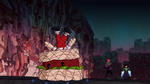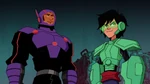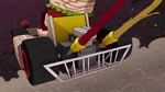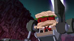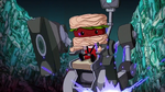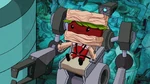 Baymax talks with Noodle Burger Boy, who reveals he is waiting for Big Hero 6 to arrive and to defeat them. Fred, Honey and Go Go then arrive to the dump and try attacking the robot, but once again they are overwhelmed since Noodle Burger Boy predicts their attacks. Back at the lab, Hiro and Wasabi stopped bickering and they apologized to each other and they know about Noodle Burger Boy's prediction algorithm so they decide to switch armors and they can fight that way. When both of them reunite with the rest of the team at the dump, Noodle Burger Boy admits he cannot predict their moves, so he attacks them directly with the mech. The team however defeat him thanks to Hiro and Wasabi's switched-up skills but soon Noodle Burger Boy escapes when they are distracted.