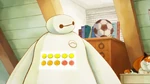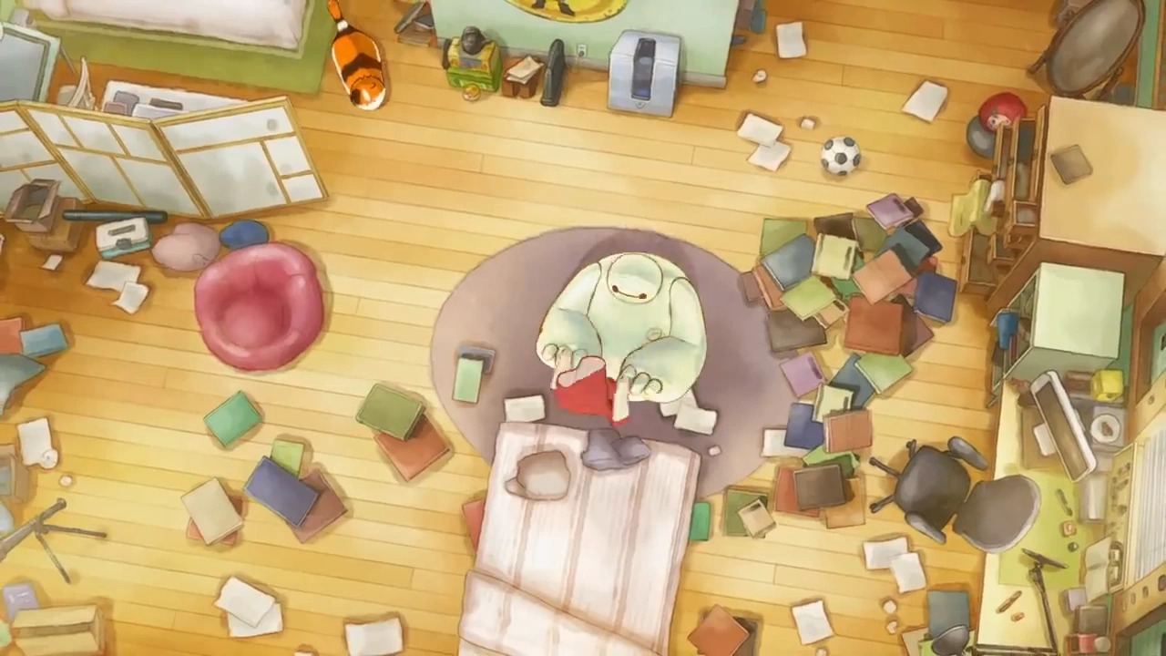 Baymax enters Hiro's room and sees it is made a mess. Mochi stands on a pile of books, and Baymax tries to grab him because it's not safe to stand on them. Mochi runs away, so Baymax tries to pick up the books but he accidentally turns on a tablet and music starts to play.