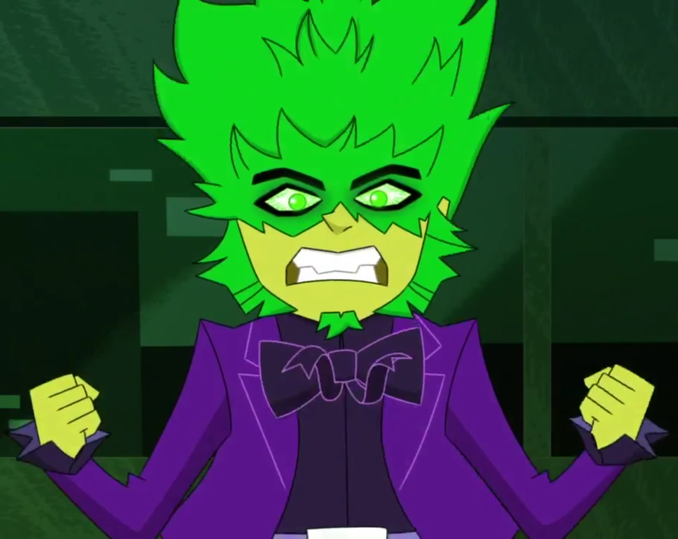 When mutated with algae DNA, Mr. Sparkles' skin turns a sickly color, and he grows hair-like algae over his head and face. His eyes glow green as well.