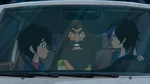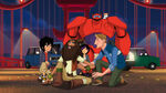 While Hiro tends to Go Go, Krei fashions a makeshift brace for Go Go to walk in. When Hiro asks how he could know such survival skills, Krei, glad to explain, explains how he used to go to Fire Scout Camp as a child in the summers he spent home from boarding school and spent time in the woods without any friends. Hiro suddenly gets a text presumably from Fred: "Everything is fine and Mochi isn't lost." Go Go is surprised Hiro got a text while they were still in Bessie's range and she and Krei check their own phones which are also receptive again. The Hibagon closes back in on them; Krei asks the two of them, "Do you trust me?" and, after getting confirmation from them, runs off and comes back moments later with the van (which reactivated when Bessie was contained) and saves Hiro and Go Go. The trio drives out of the forest, but the Hibagon follows them on a moving truck.