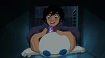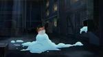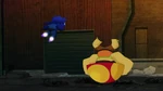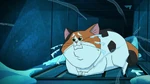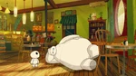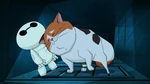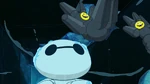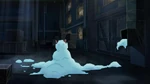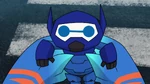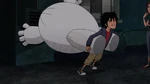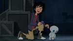 Back at the warehouse, "Mini Baymax" finds Mochi and uses his collar to help with his paw problem in the meantime. He soon notices that Mochi's other paw is stuck, and before he can free it, the air conditioning system activates. The low temperature causes Mini Baymax's body to malfunction and blow him away, so Hiro figures they will need something even smaller and leaves to get his Megabots back at home.